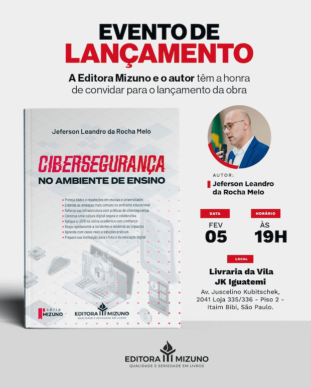 A Editora Mizuno e o autor Jeferson Melo tem a honra de convidar para o lançamento do livro “Cibersegurança no Ambiente de Ensino”.