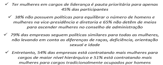A presença de práticas, processos e políticas especificas para mulheres negras, lésbicas, trans e com deficiência ainda é muito pequena. O estudo revela que 79% das empresas seguem políticas similares para todas as mulheres, não levando em conta as diferenças de raças, deficiência, orientação sexual e idade. Somente 17% possuem ações, políticas ou programas específicos para mulheres não brancas, mulheres com deficiência e mulheres não heterossexuais; 16% para mulheres trans e 7% para as mulheres acima de 50 anos.